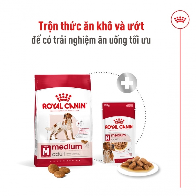 - ROYAL CANIN MEDIUM ADULT dành cho chó trưởng thành từ 11 đến 25kg và trên 12 tháng.