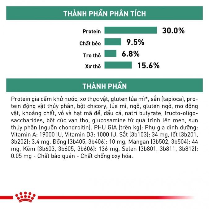 Xơ thực vật, protein gia cầm, gluten lúa mì*, bột sắn, gluten bắp, protein động vật, lúa mì, bắp, chất béo động vật, củ cải đường, dầu cá, khoáng chất, psyllium, dầu đậu nành, fructo-oligo-sacarit, glucosamine, chiết xuất cúc vạn thọ (nguồn lutein), sụn thủy phân (nguồn chondroitin).