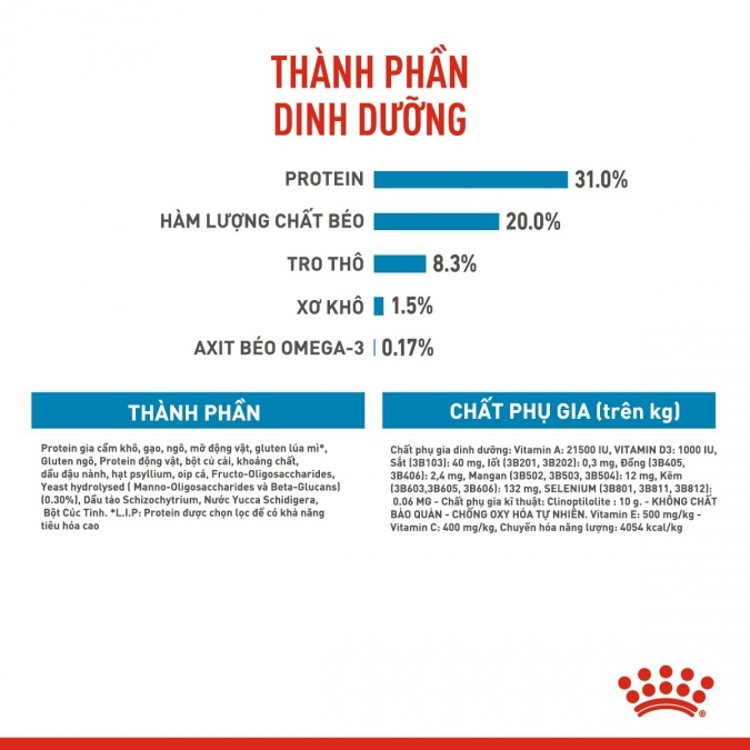 Protein gia cầm, gạo, bắp, chất béo động vật, protein thực vật*, gluten bắp, protein động vật, củ cải đường, khoáng chất, dầu đậu nành, psyllium (1%), fructo-oligo-sacarit, men thủy phân (nguồn manno-oligo-sacarit), chiết xuất men (nguồn betaglucan), chiết xuất cúc vạn thọ (nguồn lutein).