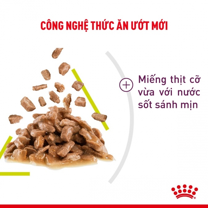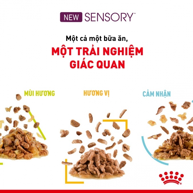 Royal Canin Sensory Wet ( Feel): Cảm giác khi thức ăn còn ở trong miệng là điều đọng lại sau cùng khi mèo thưởng thức bữa ăn. Đây là sự tương tác vừa mang tính vật lý vừa mang tính khoa học, giúp hoàn thiện hơn trải nghiệm ăn uống của mèo. Royal Canin Sensory (Feel) giúp mèo thưởng thức bữa ăn với cảm giác ngon miệng nhất với sốt thịt có kết cấu dạng thạch độc đáo, mịn hơn và tồn tại lâu hơn trong miệng mèo.